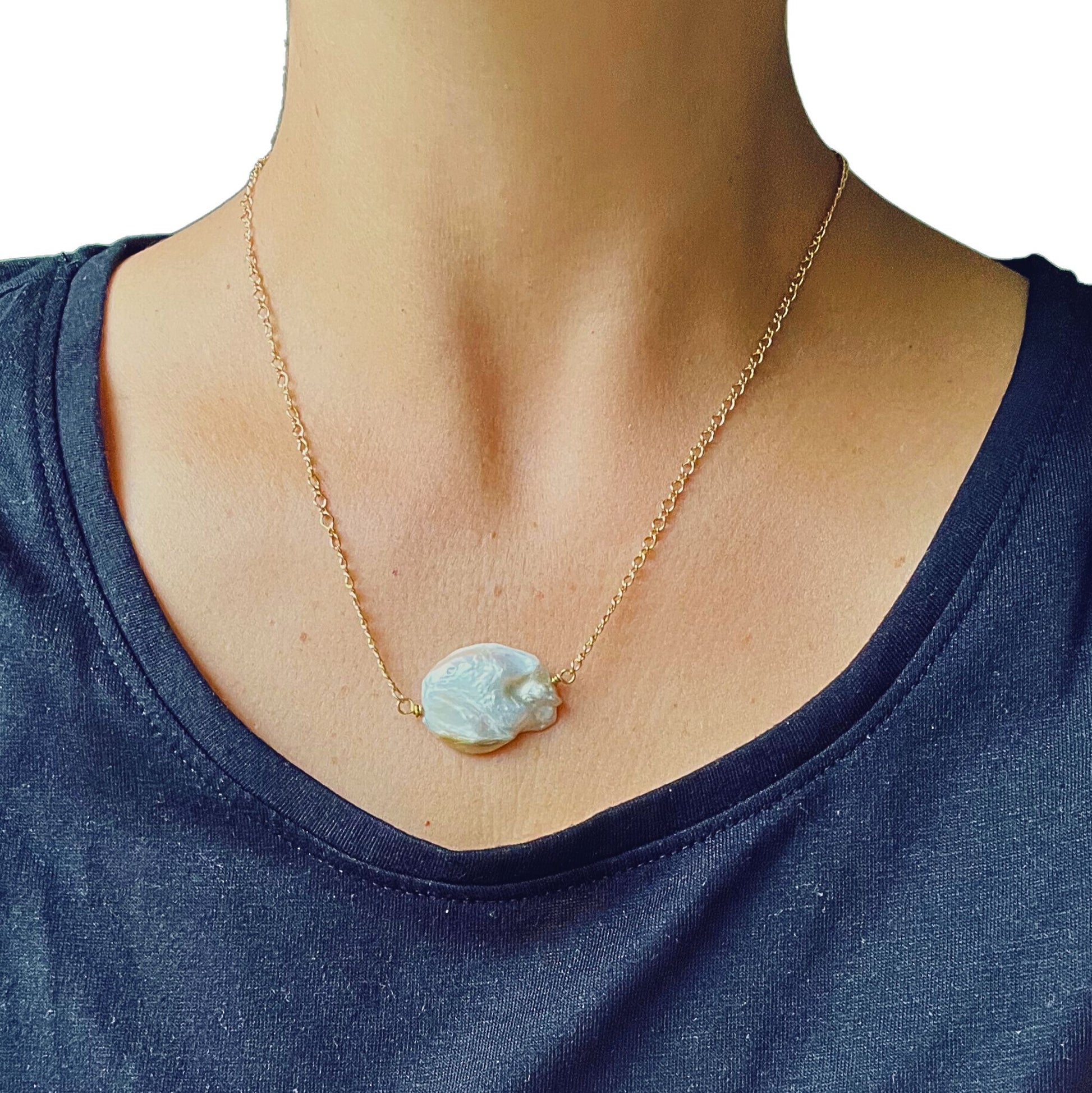 This unique necklace features a striking, irregular BAROQUE pearl, creating an eye-catching statement piece for any look. Stand out from the crowd with this one-of-a-kind accessory.